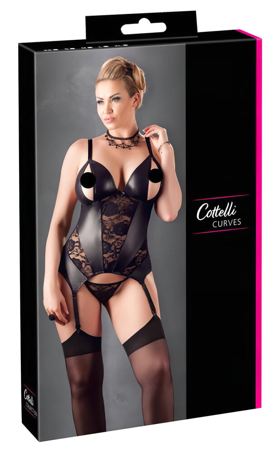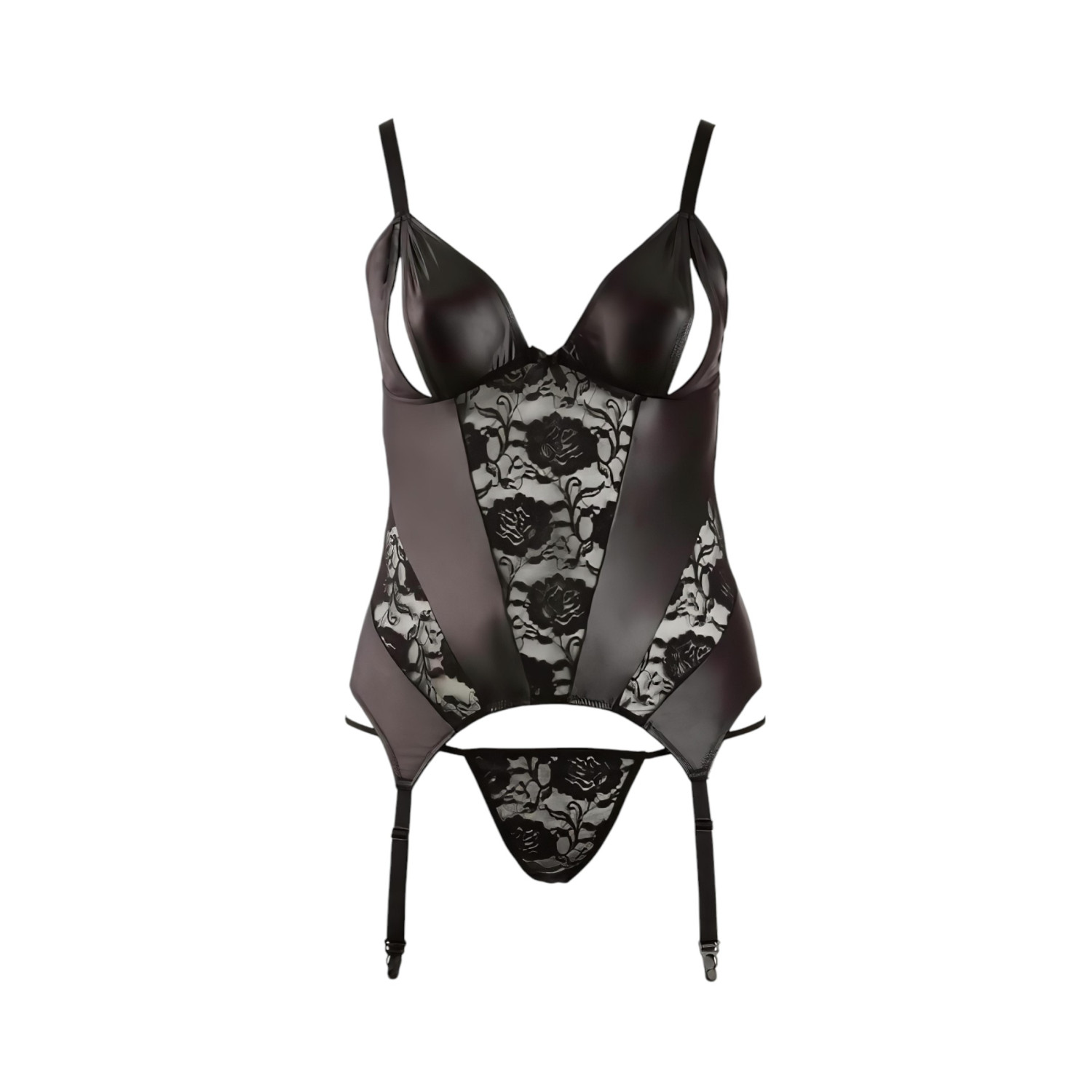 • 1 top con liguero, fabricado en material brillante efecto mojado, con detalles de encaje