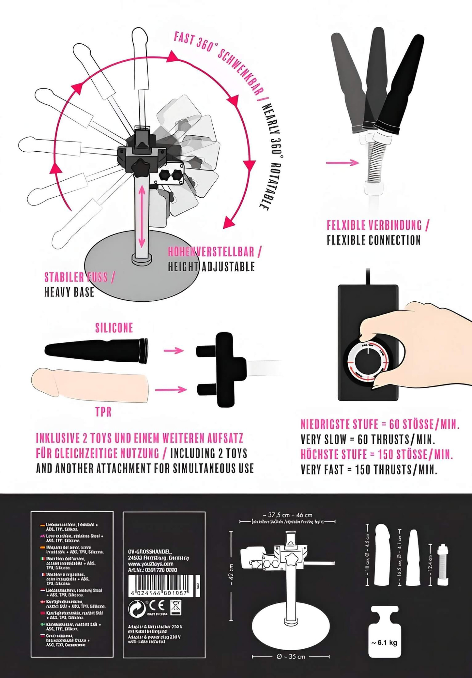 Monta la máquina como indica el manual, elige el cabezal que prefieras (simple o doble), coloca el/los dildo(s) y enchufa a la corriente. Ponte cómodo, toma el mando inalámbrico ¡y deja que empiece la acción! Regula la velocidad fácilmente con el botón - disfruta mientras la máquina hace todo el trabajo por ti.